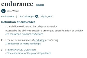 My dictionary, the old-fashioned printed kind, has three definitions, a painful number of them using a form of the word itself: 1) the act of enduring 2) the power of enduring, a) the ability to last, continue, or remain, b) the ability to stand pain, distress, fatigue, etc.; fortitude 3) duration. Then the “rare,” that which is endured; hardship. The online M-W has a slightly different take.